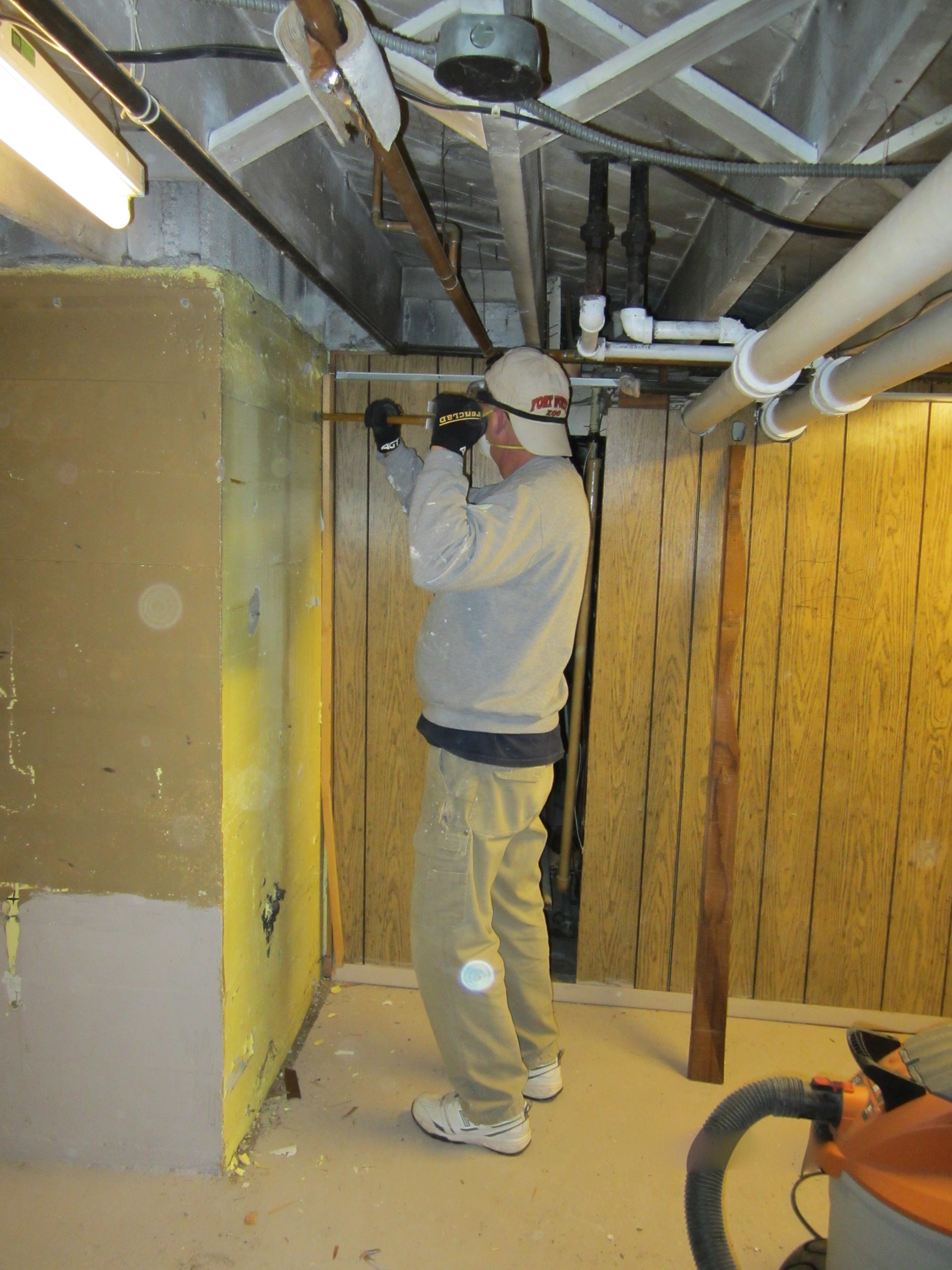 We pulled down ceiling tiles and paneling. This exposed the plumbing and electrical and the foundation walls. Good thing since we have minor issues to deal with in those two areas.