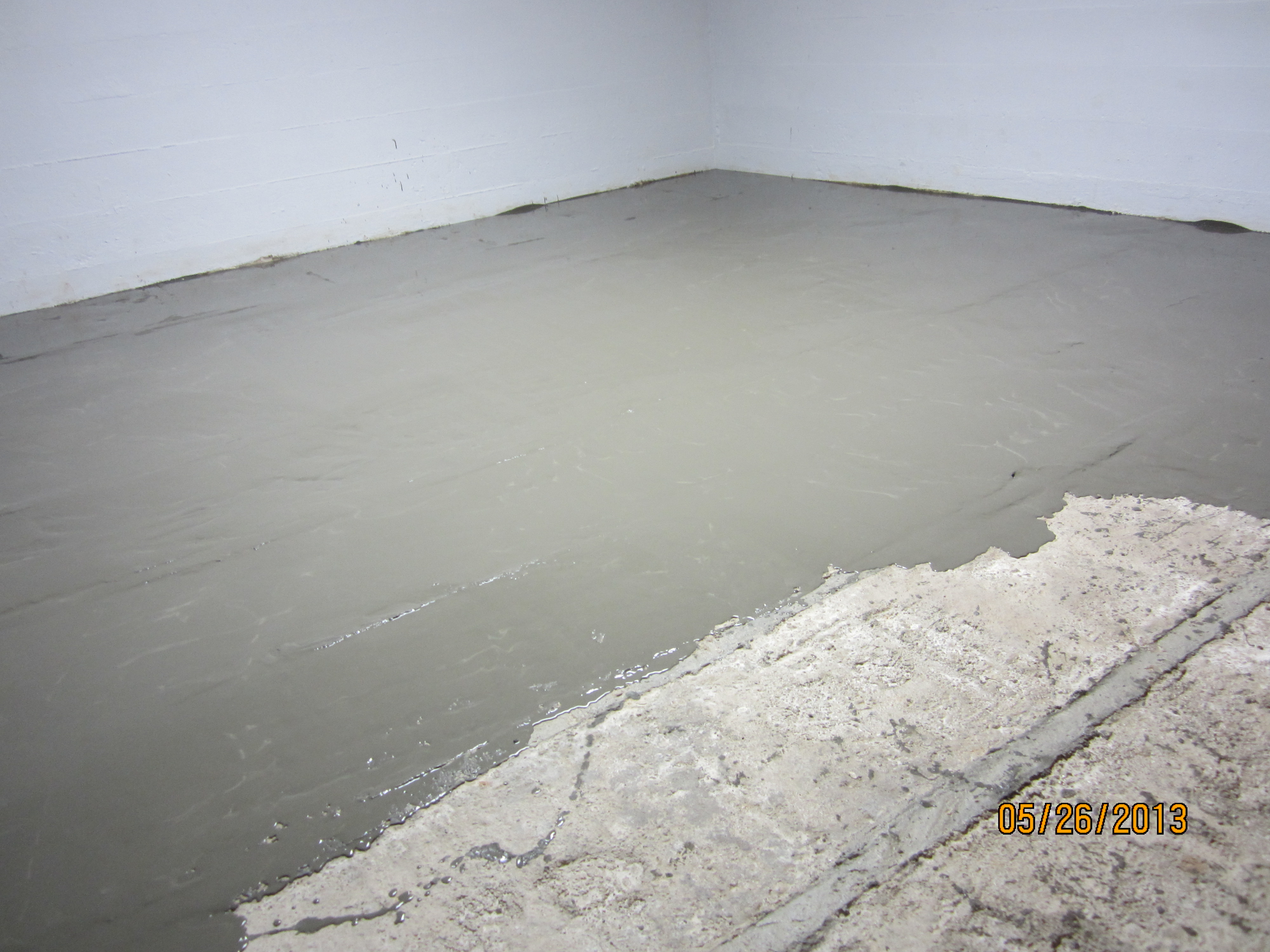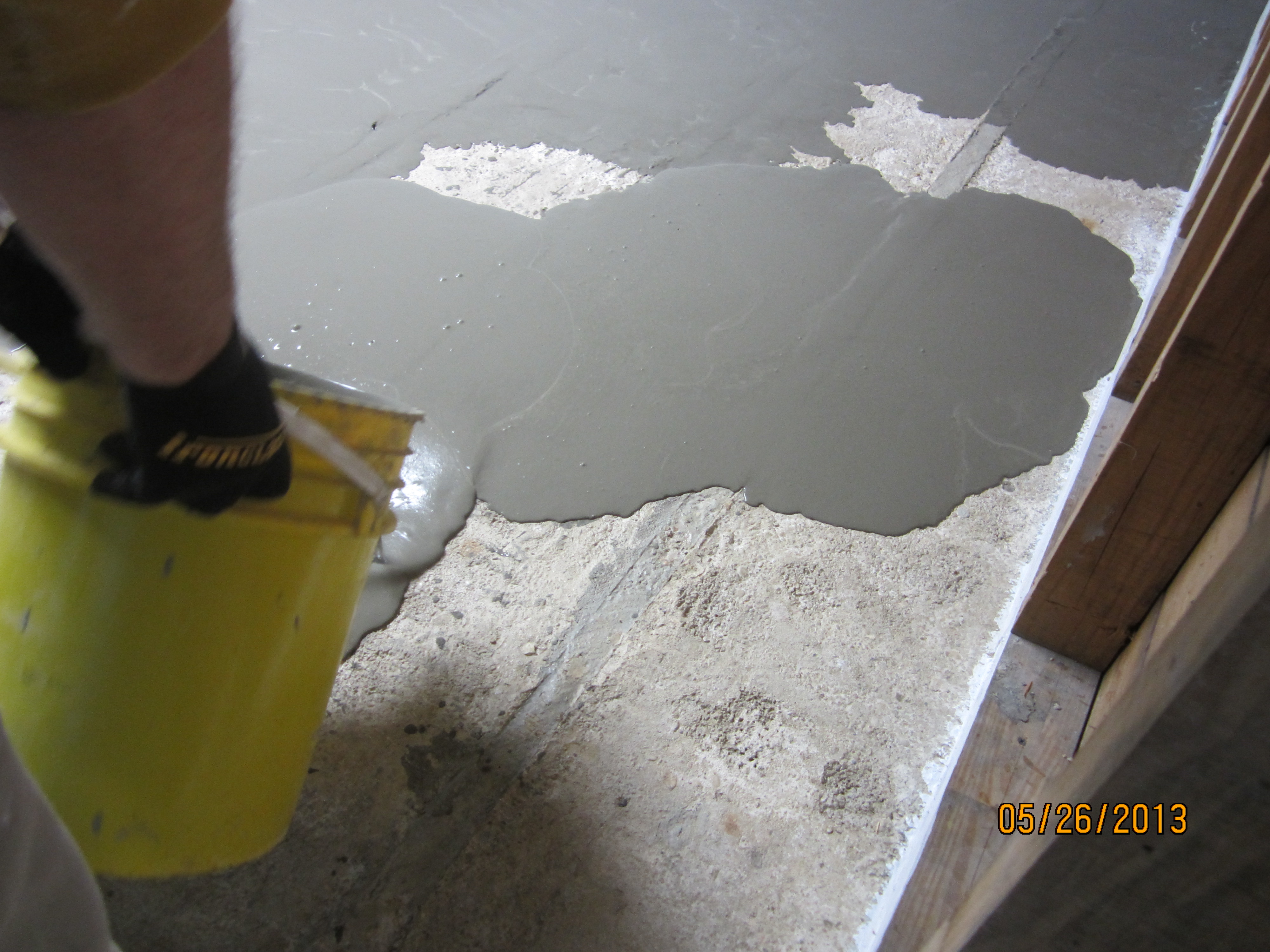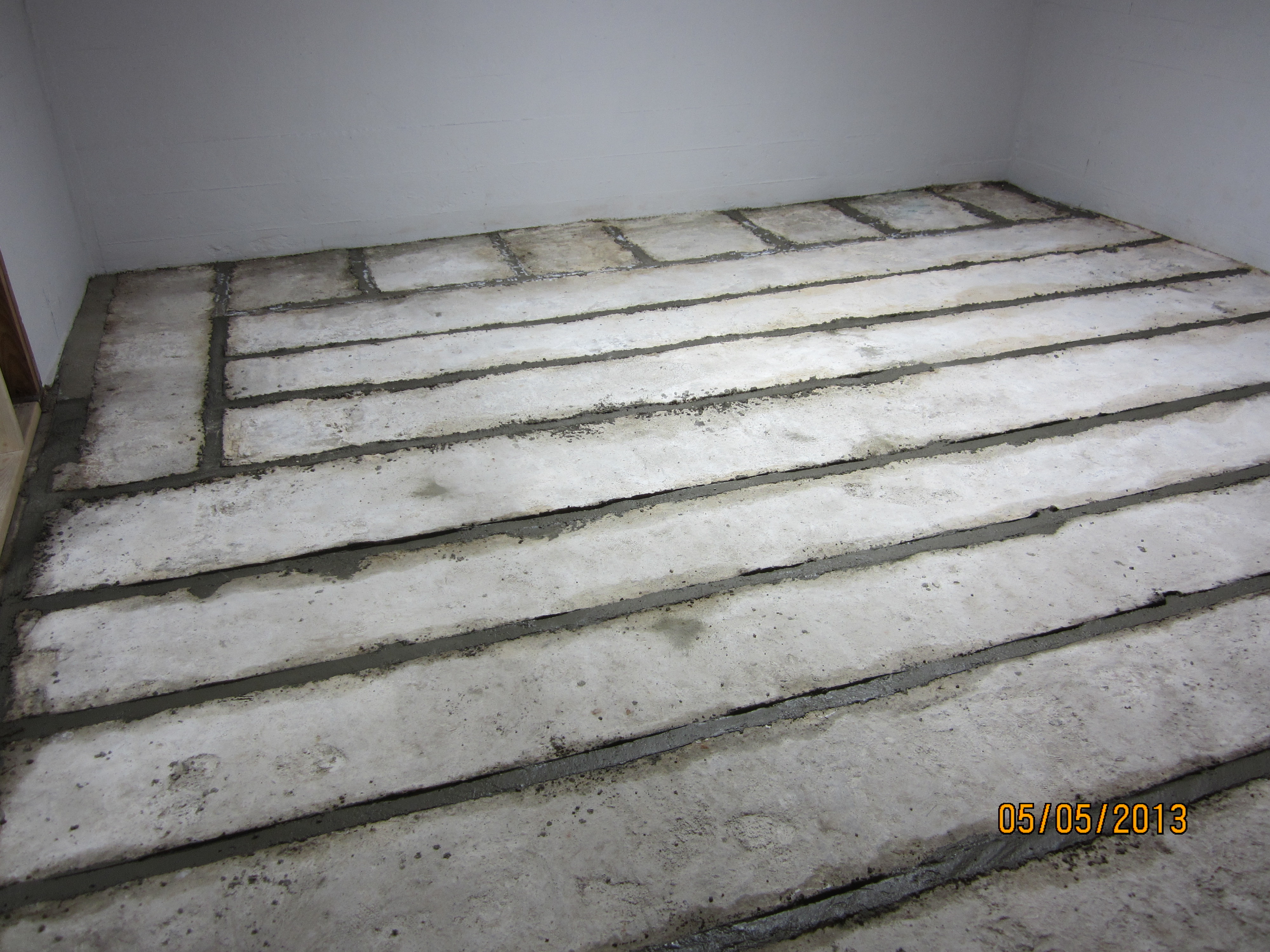 We had planned to enclose this area and use it as a storage room. We contemplated rearranging our plans, but decided to stay with our original idea when we saw the floor staying dry after the gutter repair. But to be on the cautious side and save ourselves from any future seepage issues, we decided to create a water tight floor. So now comes the really fun part. Part three. My son and I dry-vac’d the gunk and decayed wood from the space between the concrete slabs. (Three days). Another day was spent breaking up the calcite and vacuuming it off the concrete slab. The calcite forms with repeated contact of water to the concrete slab. Nothing will adhere to the concrete if this is not cleaned off. Add one more day of spraying an adhesive onto all old concrete in the channels so it would adhere to the new concrete. Then I poured concrete in these spaces. (Four days). Next, my husband, son and I worked as a well oiled team and poured self leveling underlayment on top of all this. (One day).