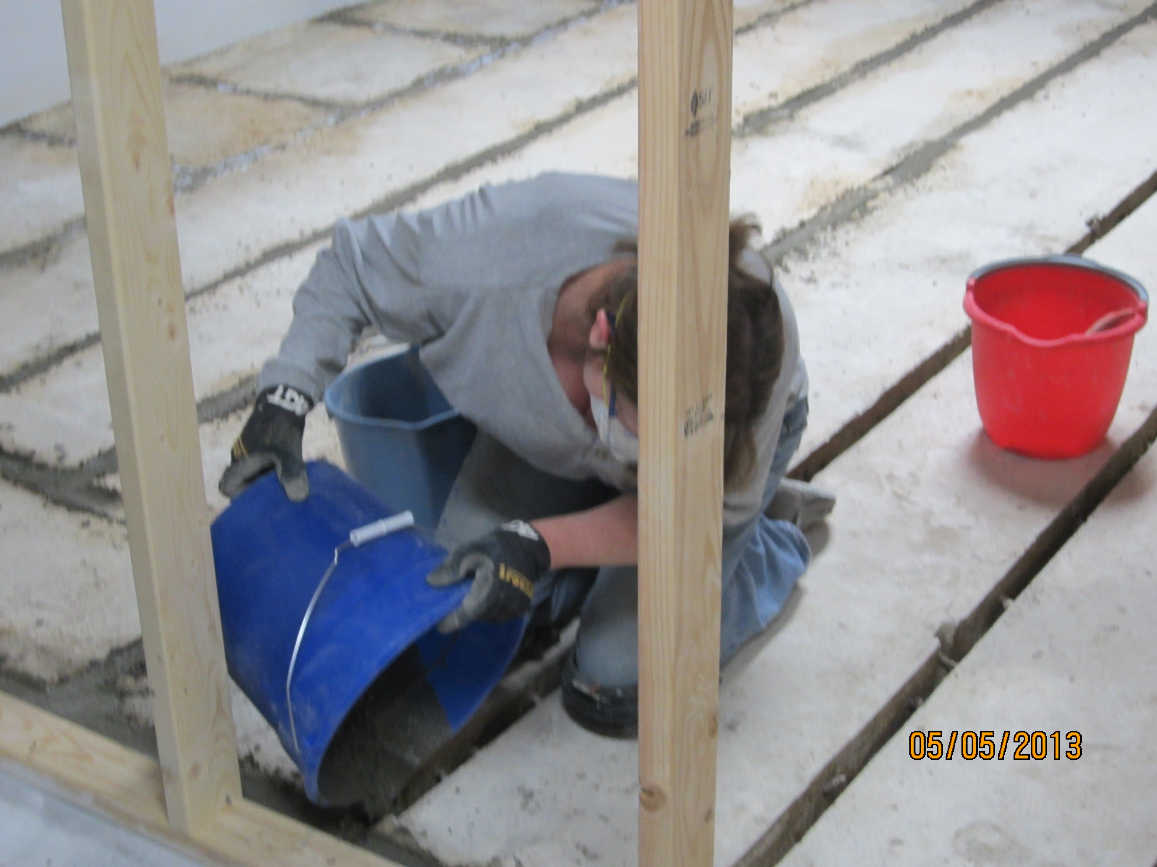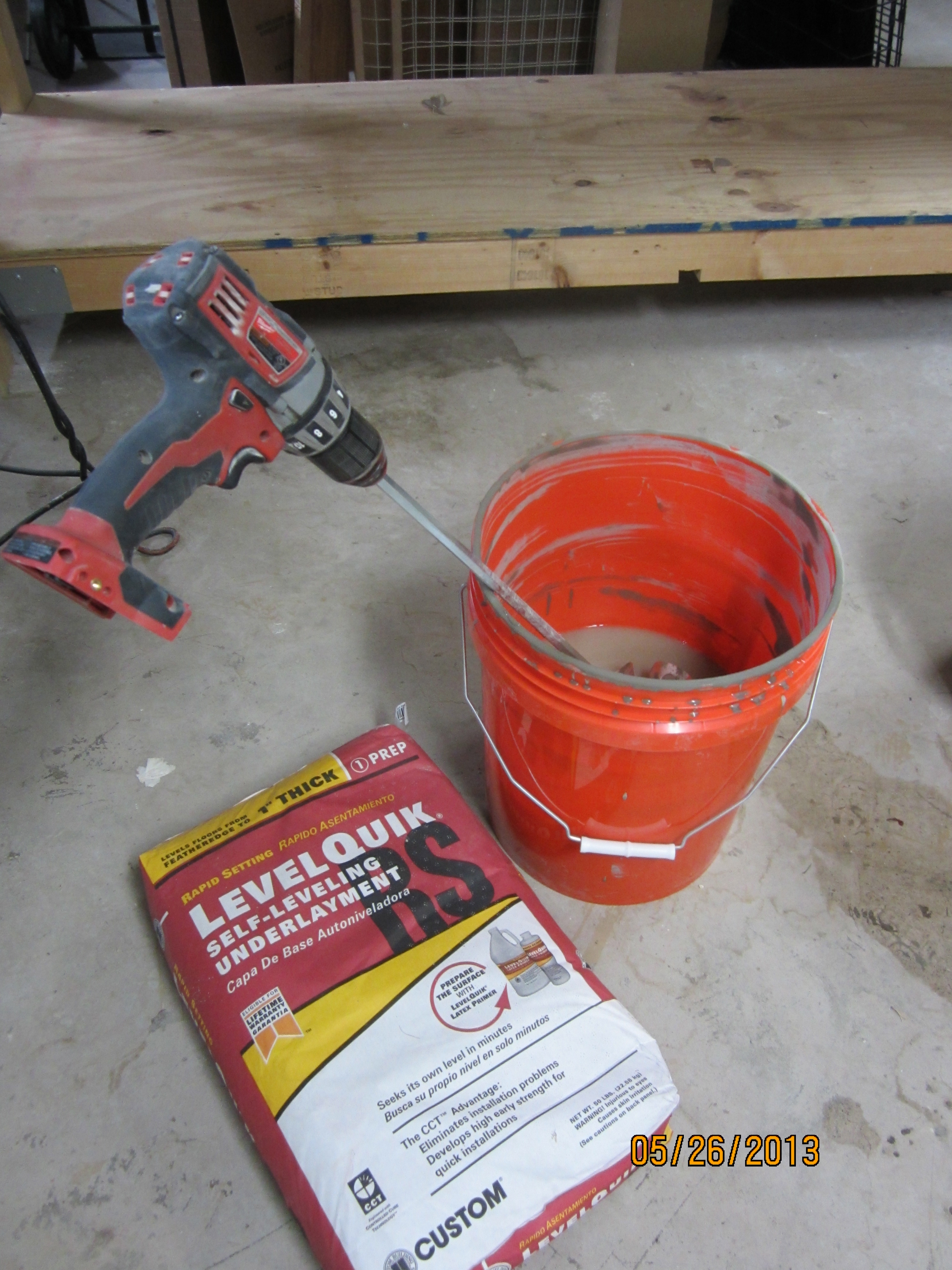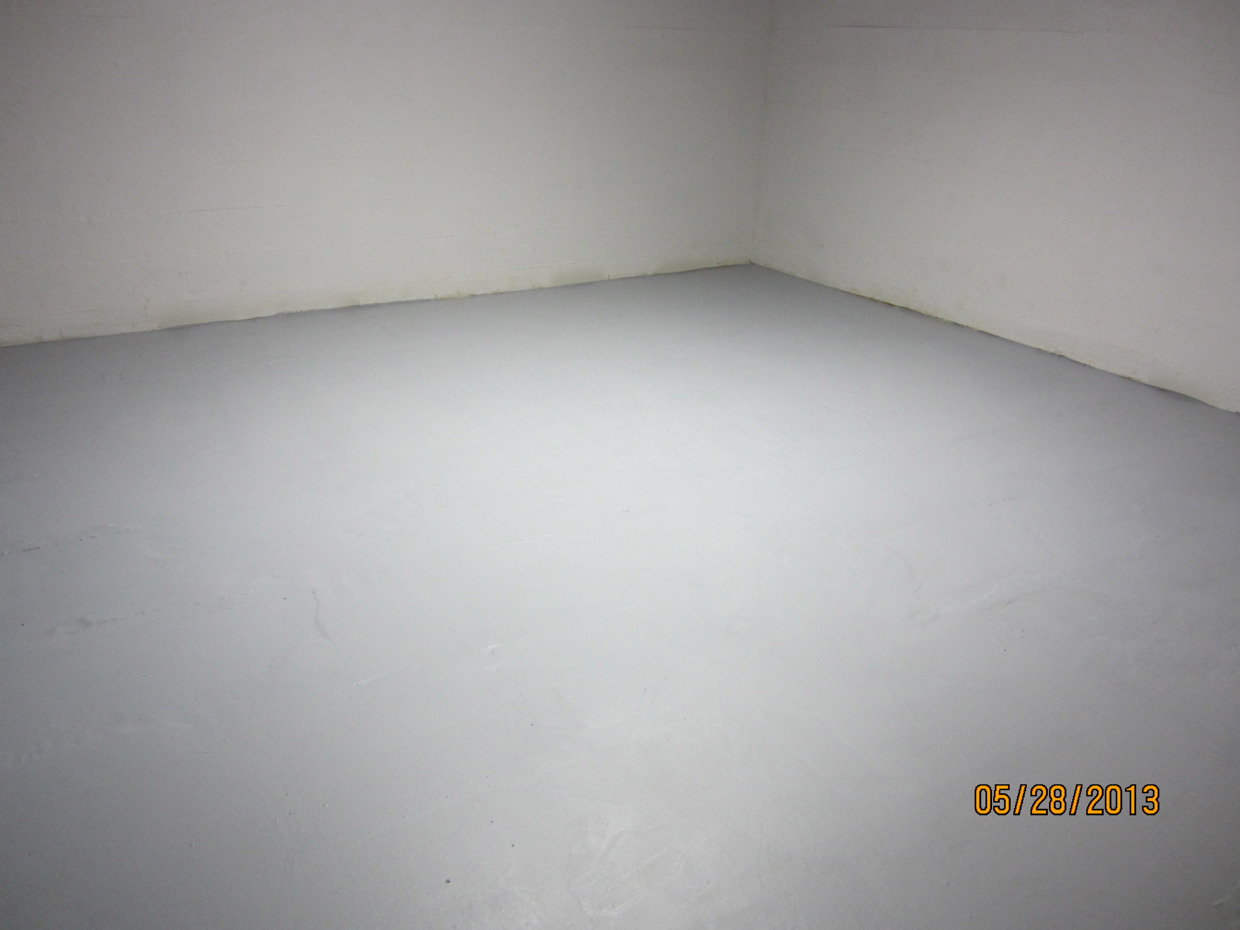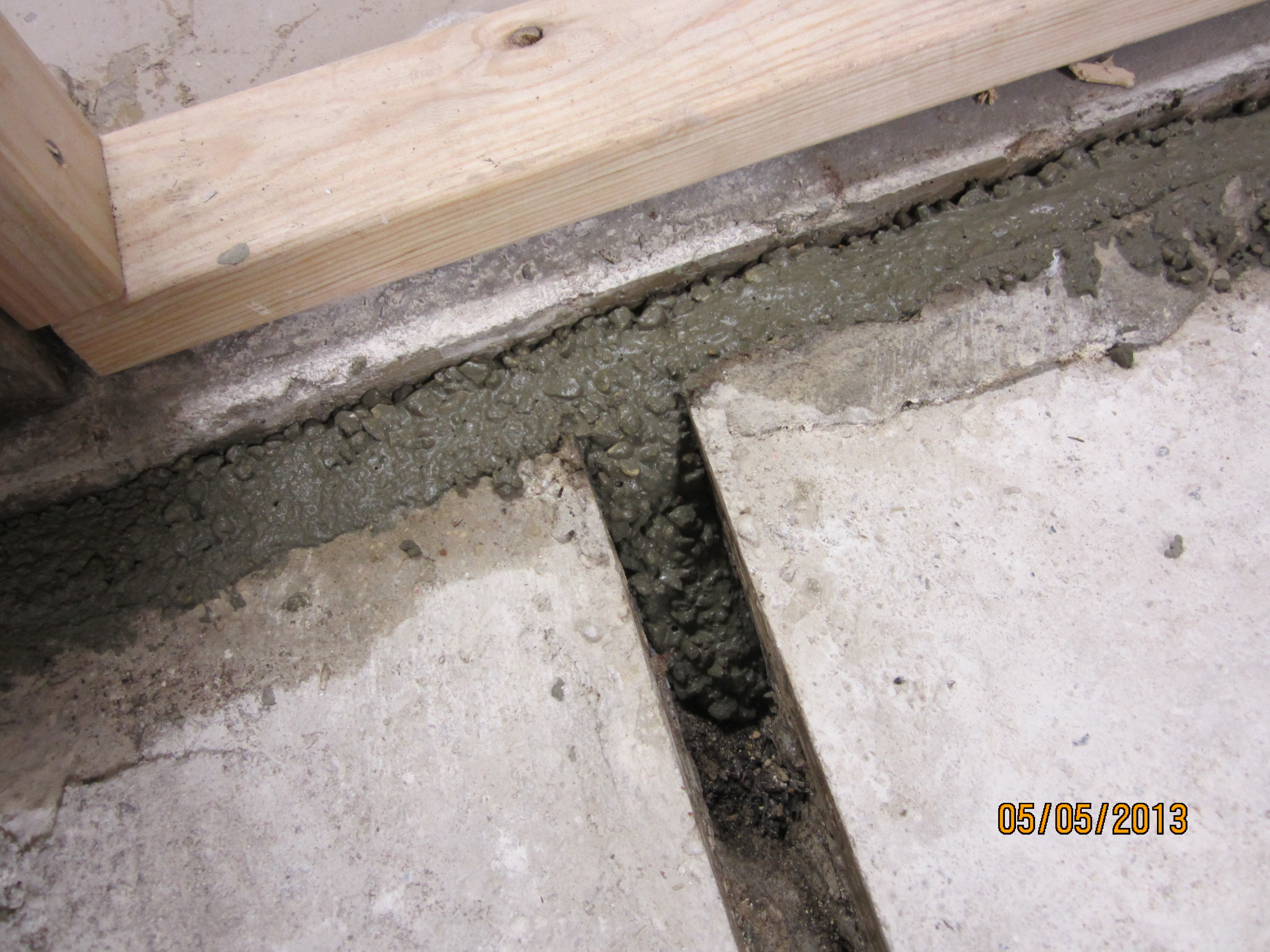 We had planned to enclose this area and use it as a storage room. We contemplated rearranging our plans, but decided to stay with our original idea when we saw the floor staying dry after the gutter repair. But to be on the cautious side and save ourselves from any future seepage issues, we decided to create a water tight floor. So now comes the really fun part. Part three. My son and I dry-vac’d the gunk and decayed wood from the space between the concrete slabs. (Three days). Another day was spent breaking up the calcite and vacuuming it off the concrete slab. The calcite forms with repeated contact of water to the concrete slab. Nothing will adhere to the concrete if this is not cleaned off. Add one more day of spraying an adhesive onto all old concrete in the channels so it would adhere to the new concrete. Then I poured concrete in these spaces. (Four days). Next, my husband, son and I worked as a well oiled team and poured self leveling underlayment on top of all this. (One day).