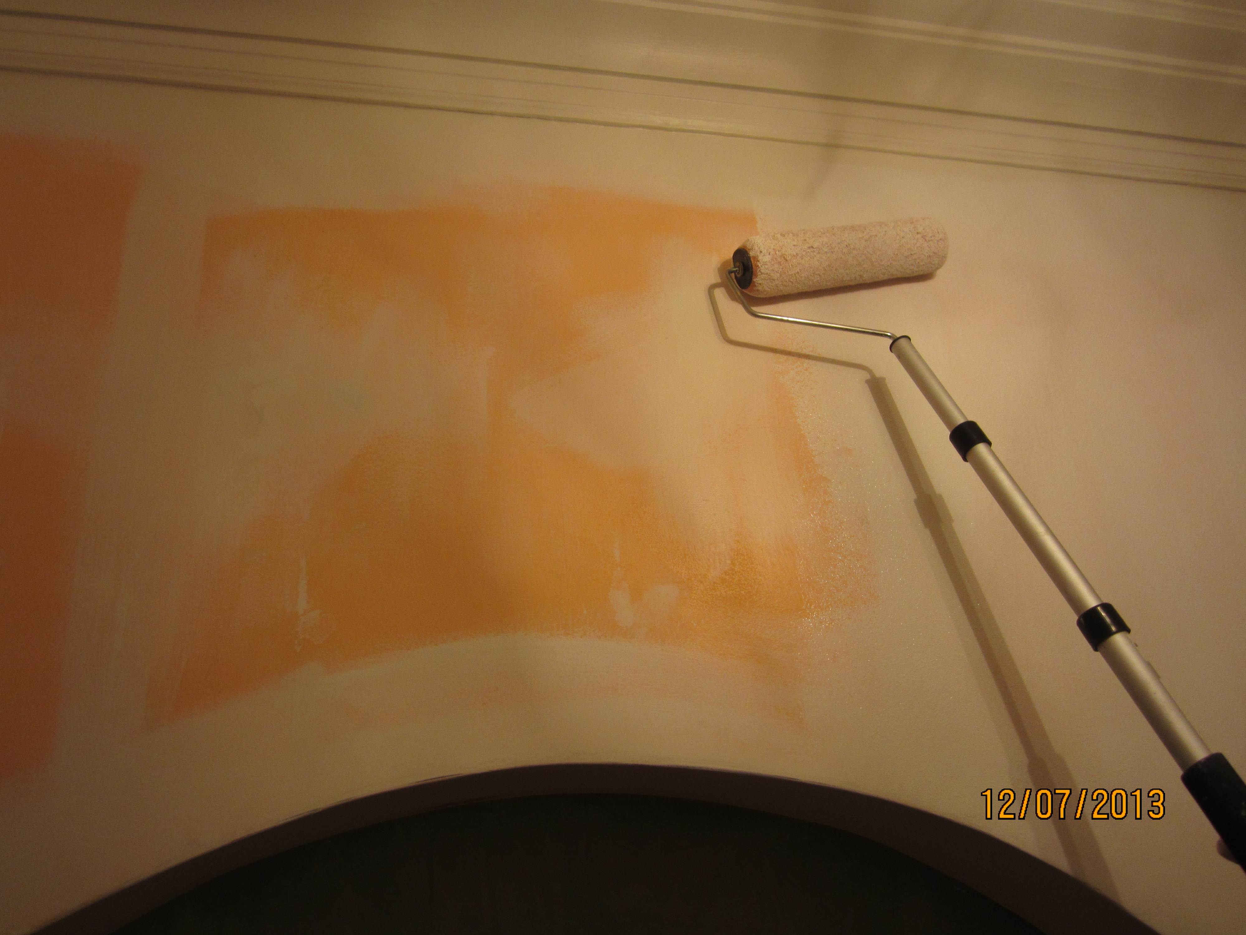 He also scraped away built-up paint layers around the picture frame railing and the crown moulding.