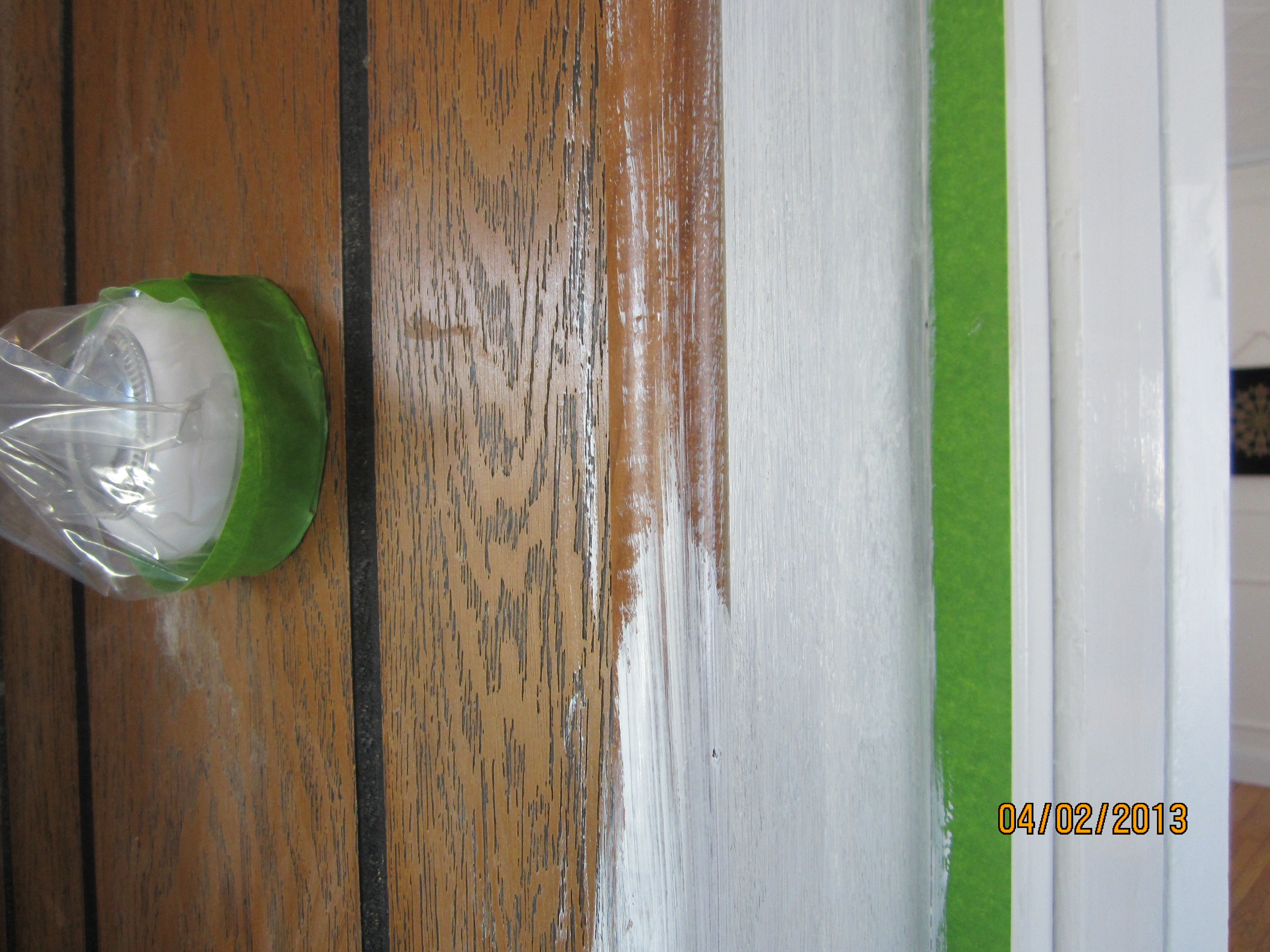 The prime coat took a LONG time. The rough texture of the plywood and that inconvenient black groove in the paneling were a pain in the shoulder, it all had to be brushed. So I corralled my son to do this part. Thank you, corralled son.