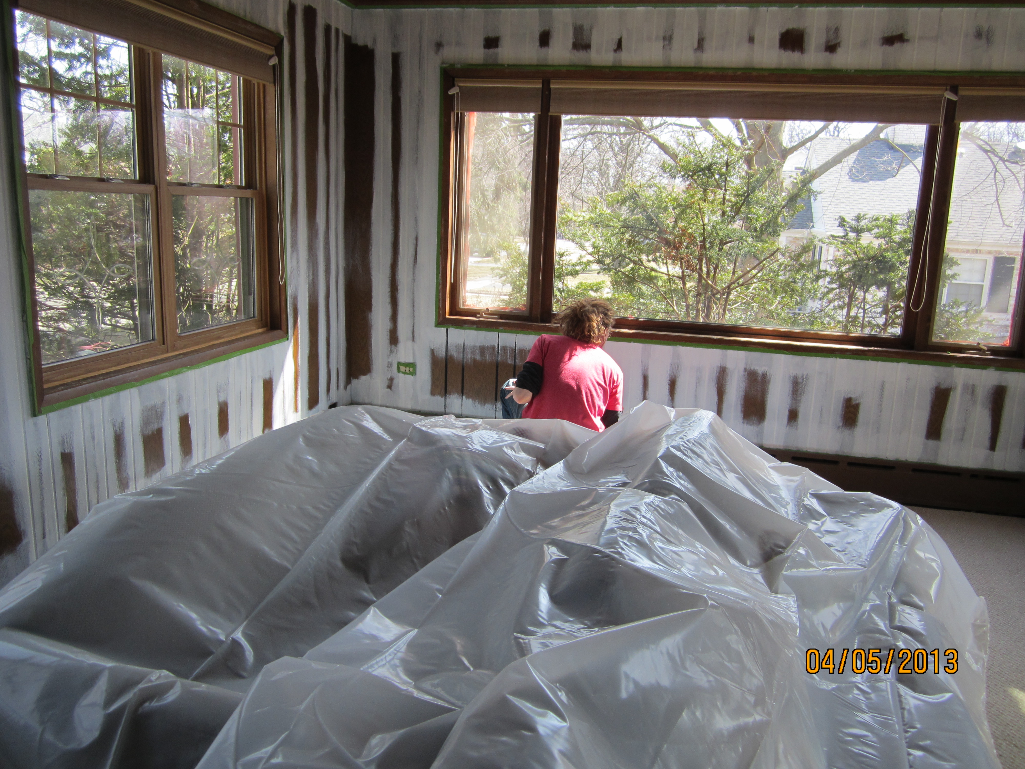We began by washing the ceiling and walls with Murphy’s Oil Soap. I removed a lot of picture hangers and the odd nail from the walls, repaired holes and caulked the paneling seams as well as other odd spaces. The wood sill of the large picture window was sanded and re-stained to complement the ceiling.
