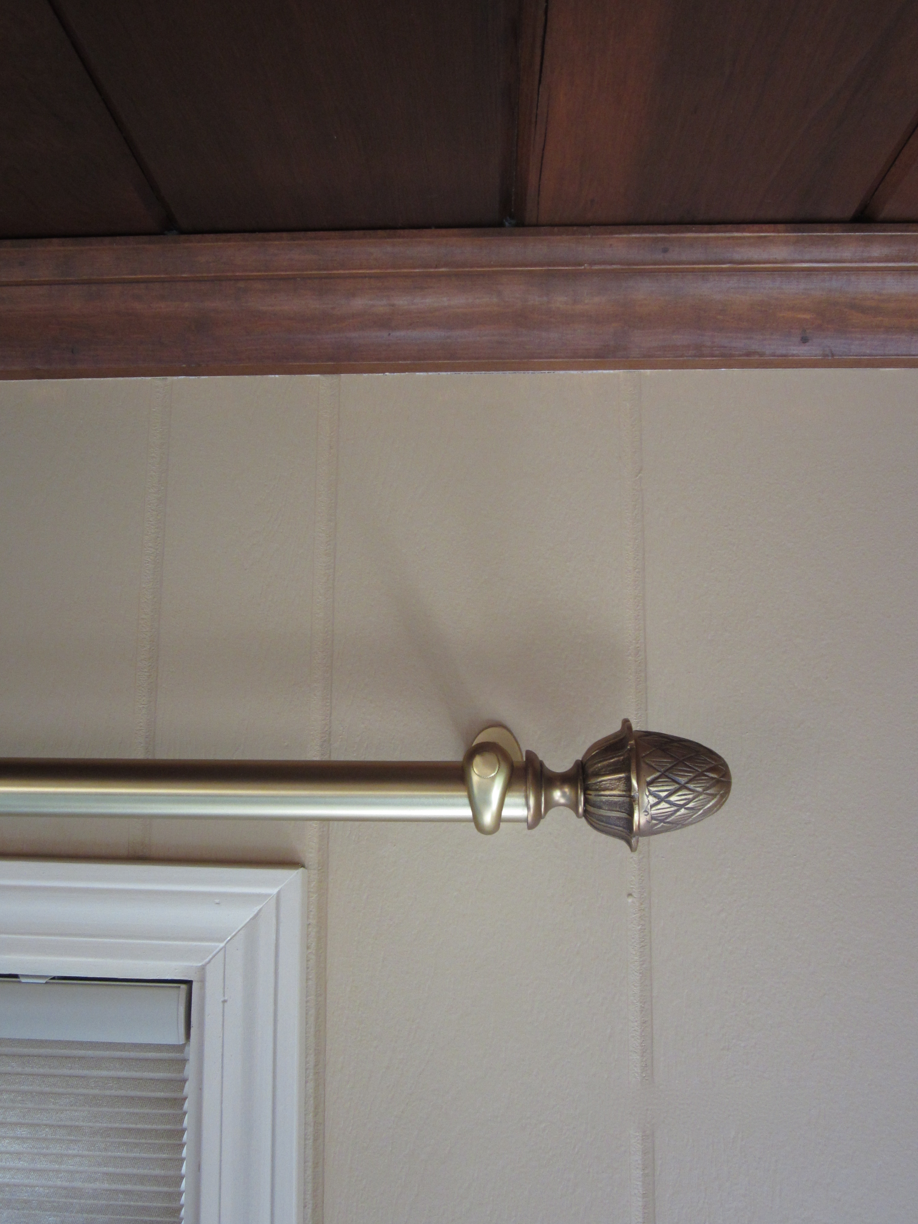 We installed cordless cellular shades and gauzy drapes on brass drapery rods. Pineapple finials are perfect symbols of the hospitality of this space.