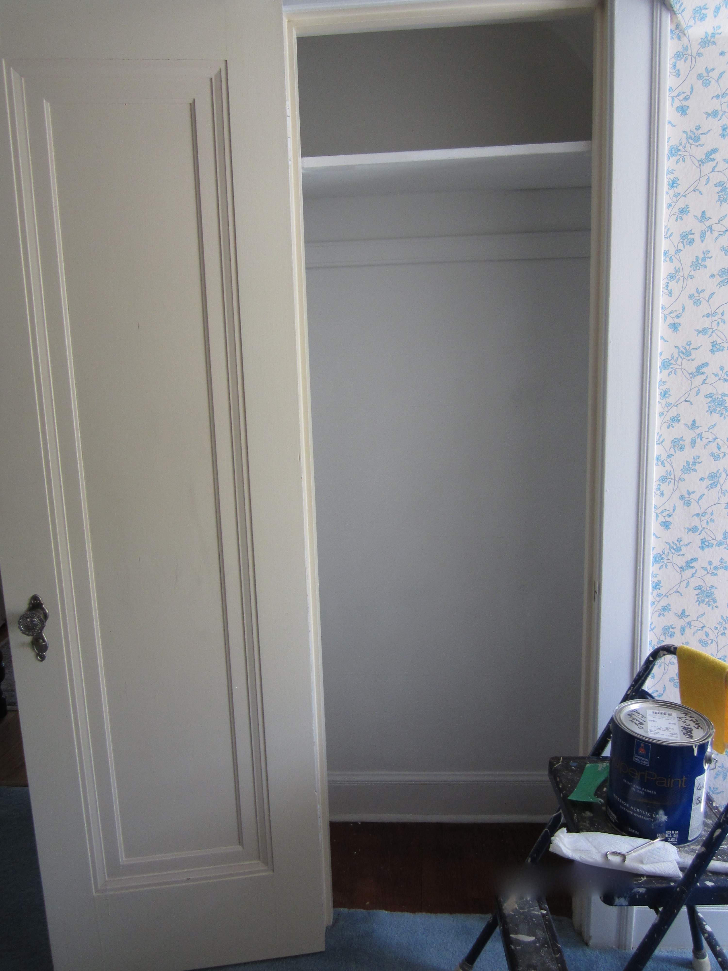 An executive decision was made not to refinish the closet door right now. That will happen when we restore the upstairs wood surfaces. Now the space is fresh and ready for …