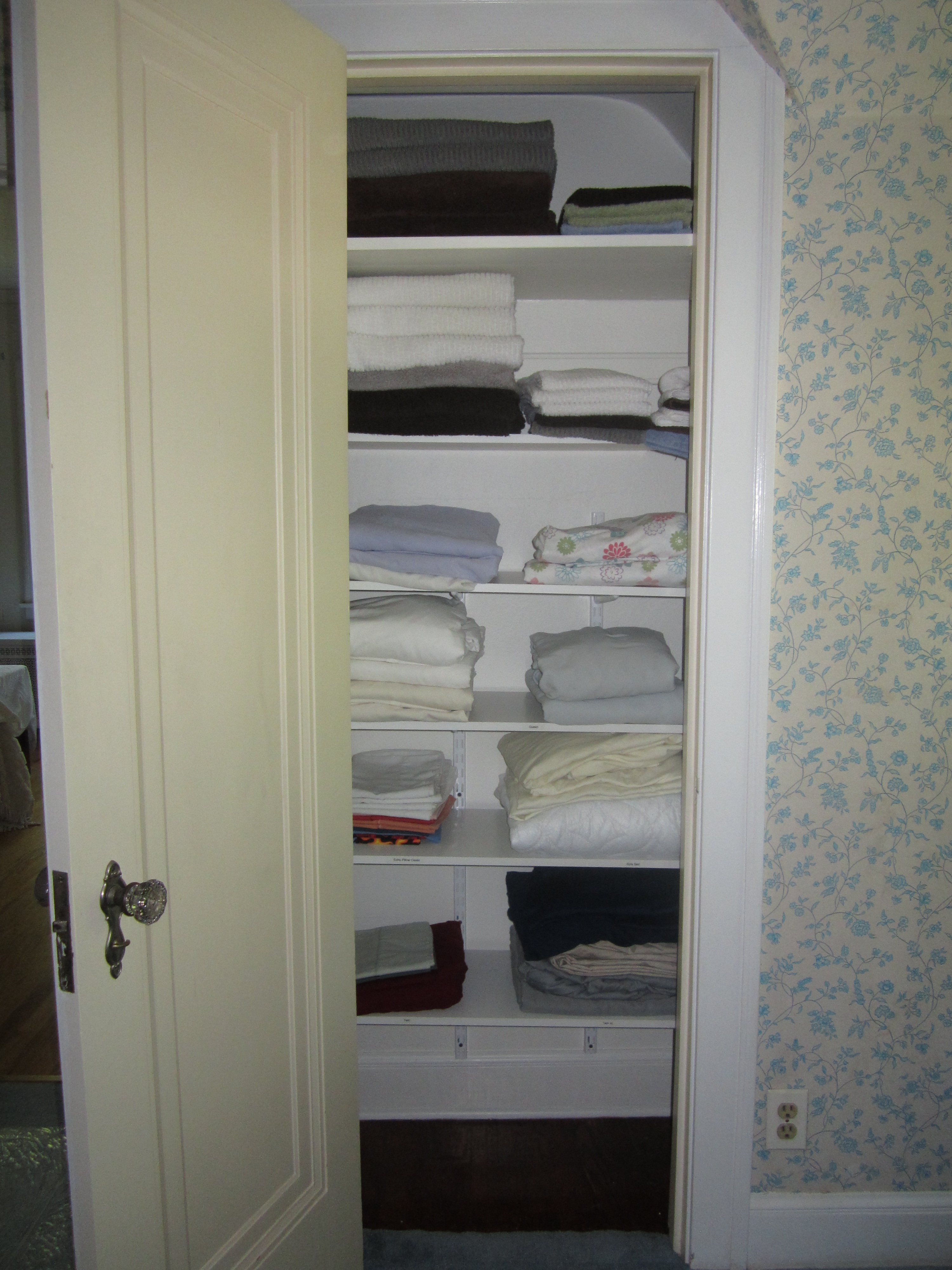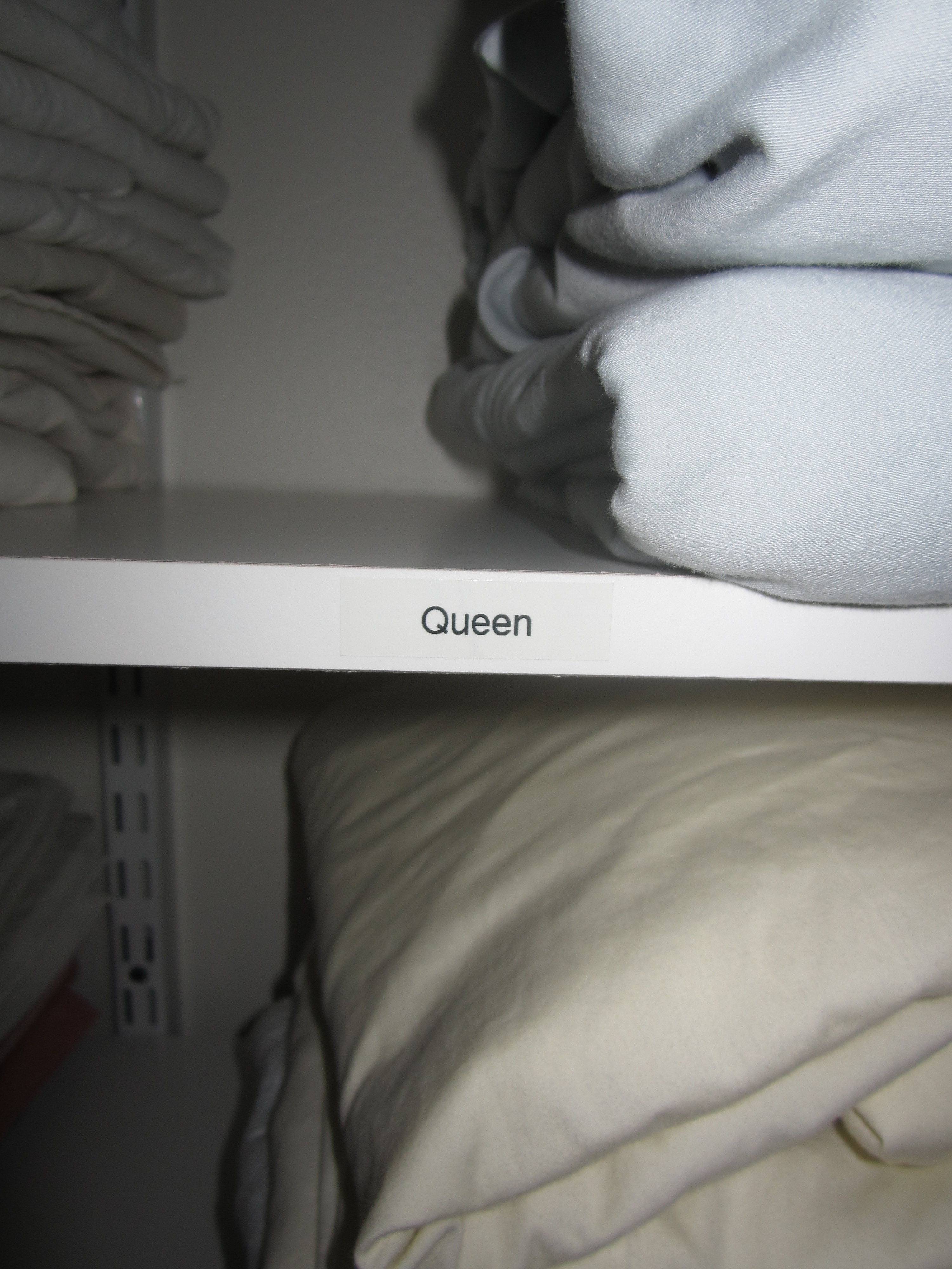 I have three bed sizes in the house and the all the sheets had become mixed up. So I took the time to refold every sheet and organize by bed size.Yes, I labeled the shelves.